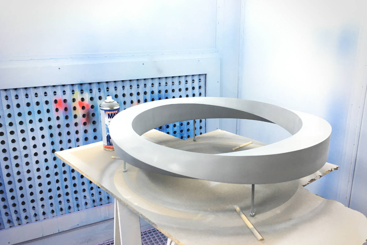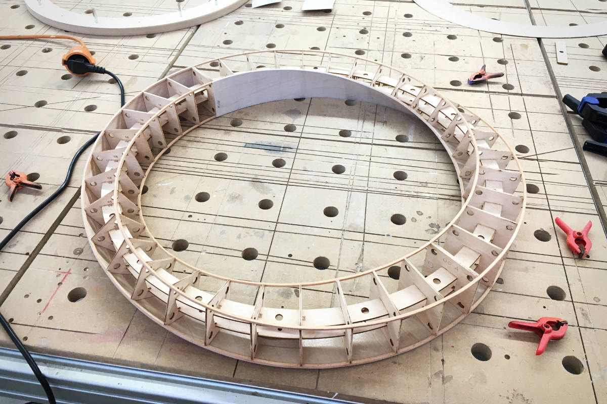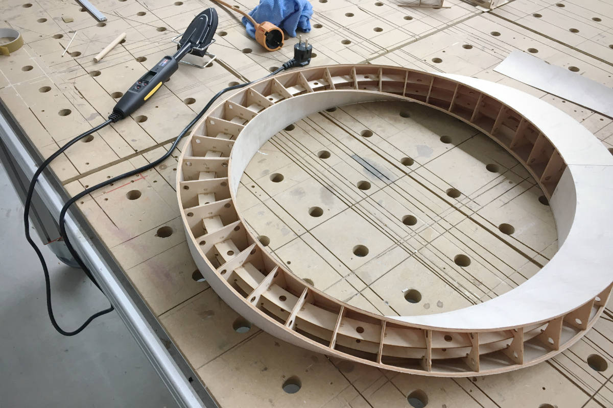 Für eine Firma mit einem Möbiusband als Logo sollte genau dieses als dreidimensionales Wandobjekt umgesetzt werden. Eine nachhaltige Materialwahl war ein besonderer Wunsch des Kunden. Der Modellbauer in mir konnte nicht widerstehen diese Objekt in klassischer Rippenbauweise aus Flugzeugsperrholz aufzubauen. Schade nur, dass man das Innenleben später nicht mehr sehen konnte. Vom Bauprozess gibt es ein Video.