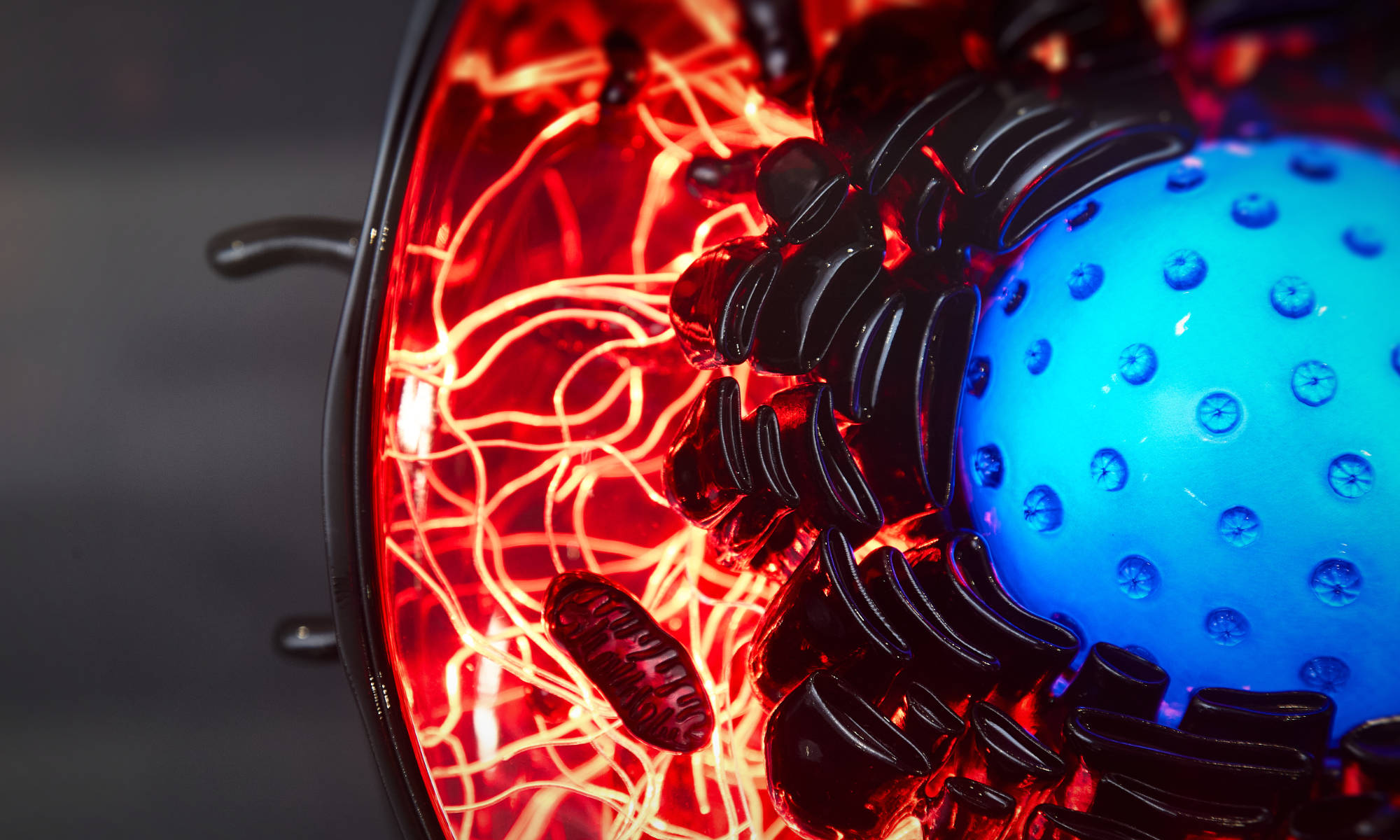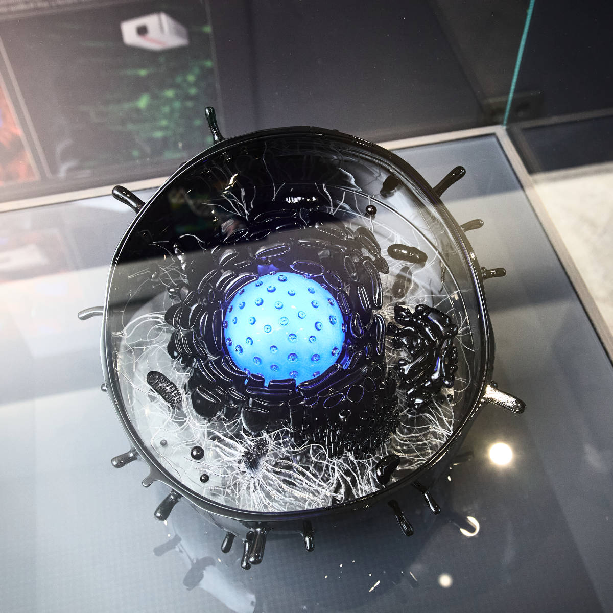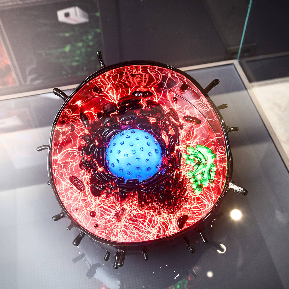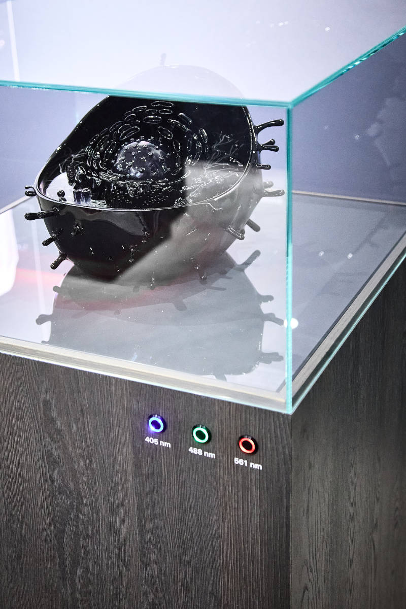 Eine weitere Aufgabe für den Showroom von TOPTICA Photonics war der Entwurf und die Umsetzung eines interaktiven Zellmodells. Es demonstriert, wie verschiedene Wellenlängen Zellstrukturen bei der konfokalen Fluoreszenzmikroskopie sichtbar machen. Die wissenschaftlich korrekte Darstellung der Zellbestandteile war dabei von zentraler Bedeutung.