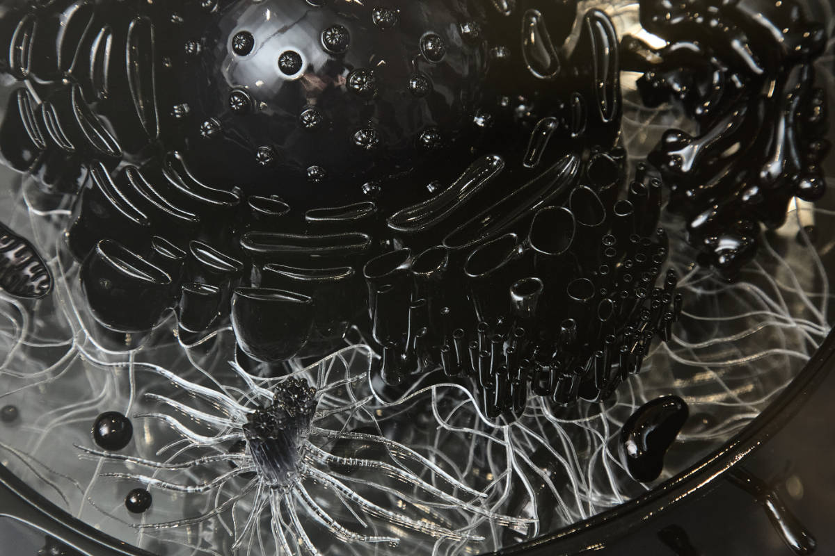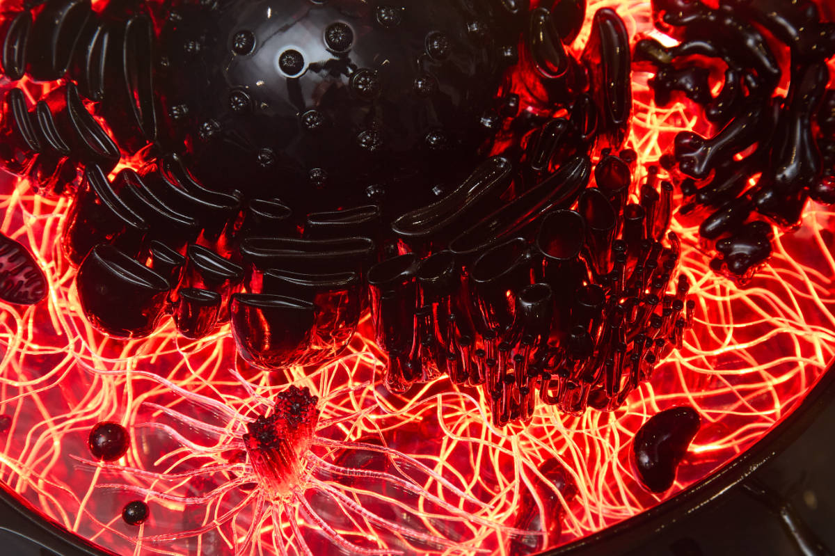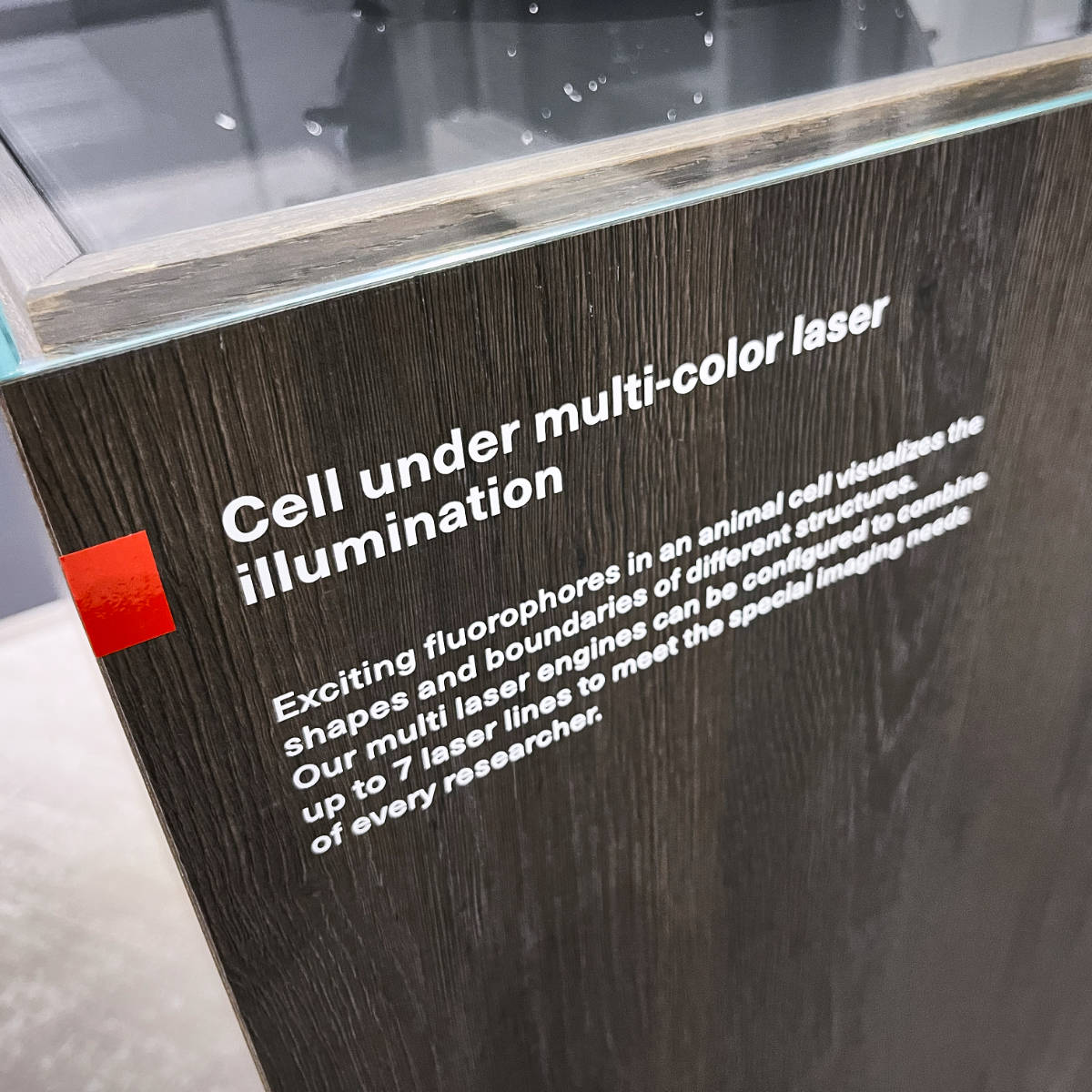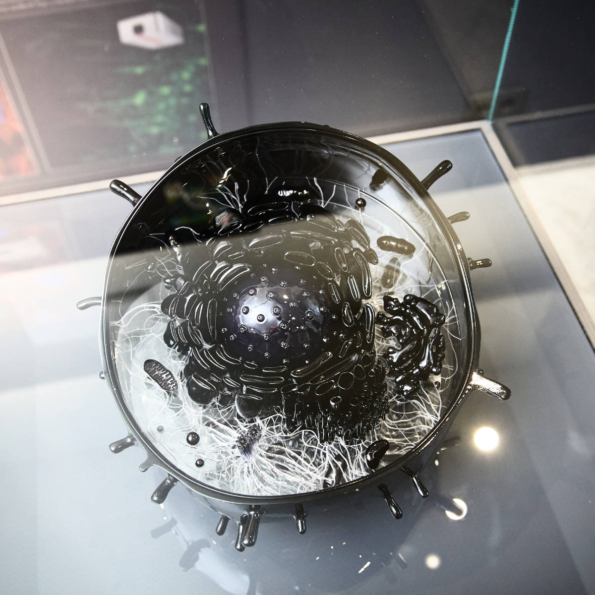 Eine weitere Aufgabe für den Showroom von TOPTICA Photonics war der Entwurf und die Umsetzung eines interaktiven Zellmodells. Es demonstriert, wie verschiedene Wellenlängen Zellstrukturen bei der konfokalen Fluoreszenzmikroskopie sichtbar machen. Die wissenschaftlich korrekte Darstellung der Zellbestandteile war dabei von zentraler Bedeutung.